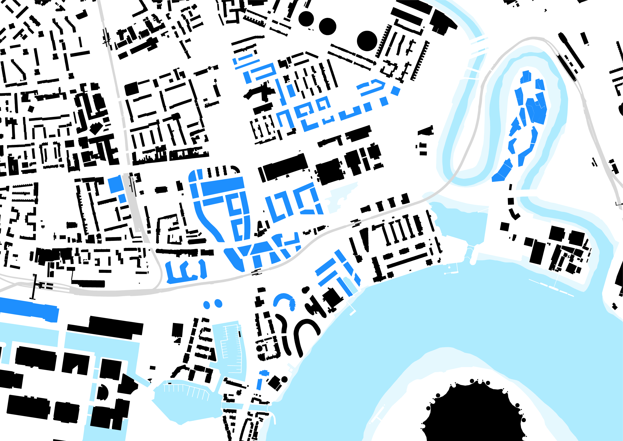 Poplar is an interesting district. It has both Robin Hood Gardens (under threat of demolition) and Goldfinger’s Balfron Tower, sister to the Trellick Tower in North Kensington (and currently undergoing a deeply controversial renovation which will displace all of its existing residents, some of them permanently). Poplar also has the Blackwall Tunnel (Northern Approach), the A13 and the A1261. The last of those is euphemistically named ‘Aspen Way’: it is not scenic, nor tree-lined, consisting of six walled-off lanes of traffic, crossable on foot only by bridge or tunnel. The Blackwall Tunnel approach road becomes the six lane A102 and runs past Balfron Tower; this urban motorway was for Lynsey Hanley the most memorable aspect of living in Goldfinger’s building, as she did for a time in the 1990s. If you plot Poplar’s buildings on a figure-ground drawing you can see they form roughly rectilinear patches, with wide separations between the patches. Within each patch, the ground coverage (and often the density as well) is historically quite low. Take into account the separations and the density drops further.