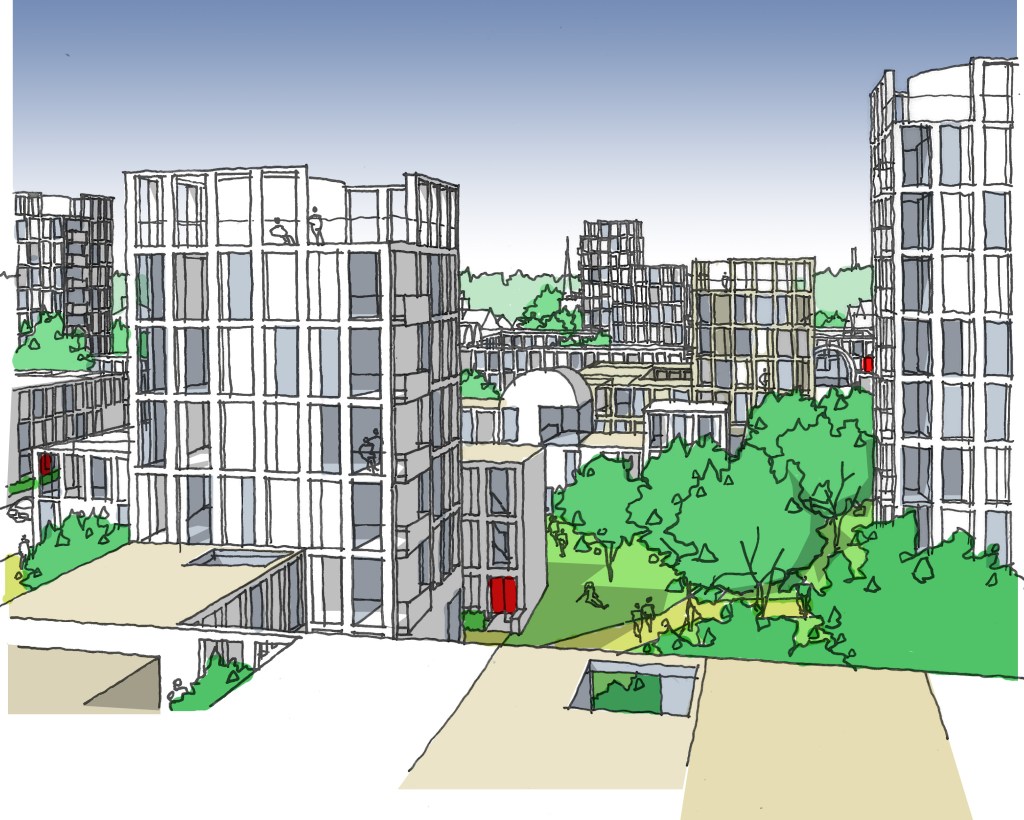 If most residents live in houses, and this type is doing most of the ‘work’ in terms of density, why provide towers at all? One reason is that household sizes vary, and it seems odd to confine smaller households to city centres; why shouldn’t single people or couples also live ‘in the countryside’? At the same time, one or two bedroom ‘houses’ are a difficult typology; these are implicitly one or two storey dwellings with diminished presence on a street and lower density. Duplex stacking offers a partial answer but the advantages of flatted development – with the right plan – are light and views. The freehand perspective above shows how the point blocks in the hybrid massing take full advantage of long views within the block, as well as having sufficient height to give distant views. Each floor in one of these blocks is a single ‘360 degree’ two bedroom dwelling, as shown in the plan below.