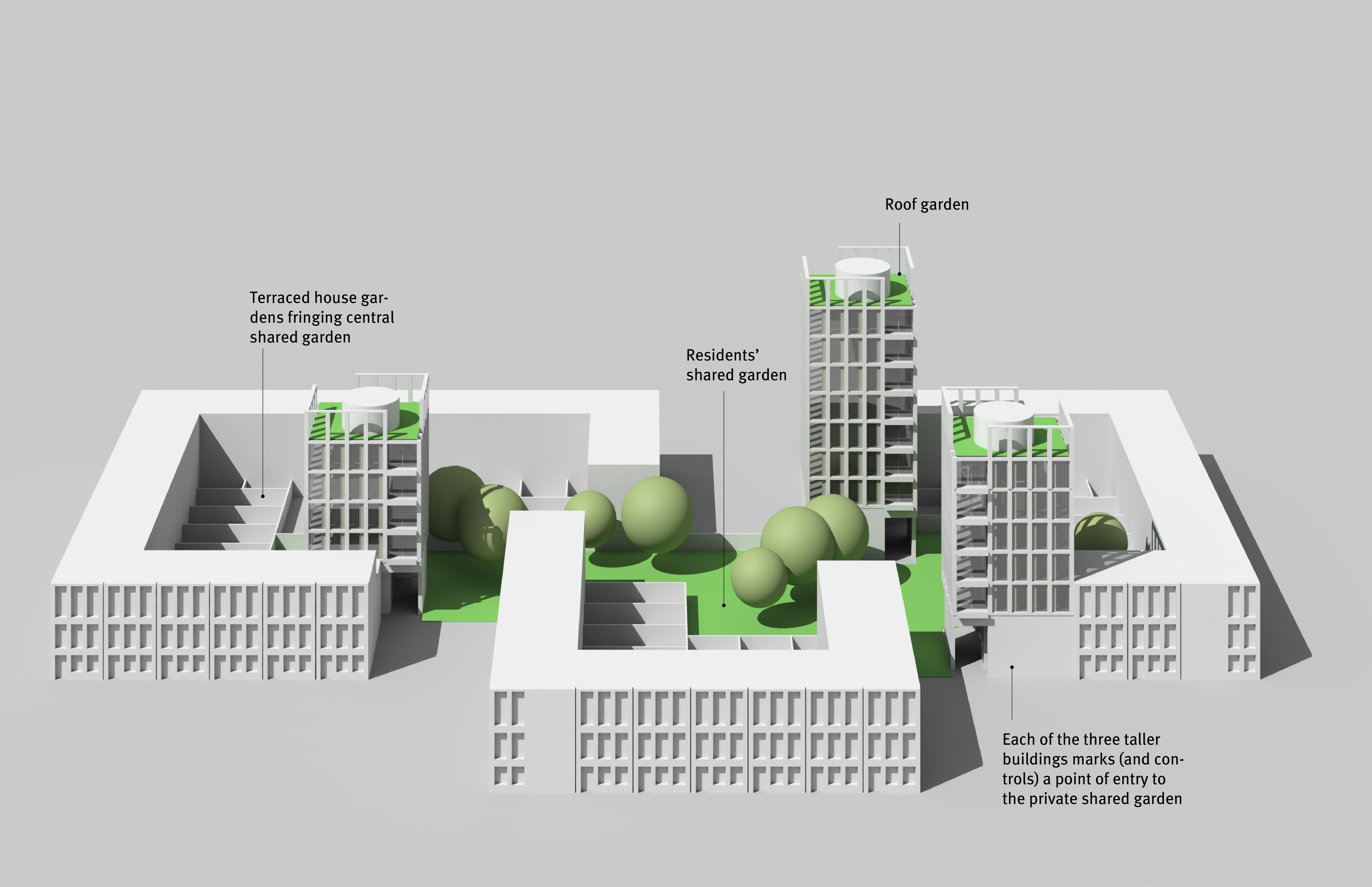 The shared garden is fringed by the private gardens of terrace houses but is also overlooked by the point block dwellings; for these blocks, the shared garden offers a park-like setting in the style of post-war modern housing, only in miniature, and without the radical ground plane permeability of that era: in effect, the proposal also hybridises models of land enclosure; some is private, some is shared but only for residents, some is public (street; pocket park).