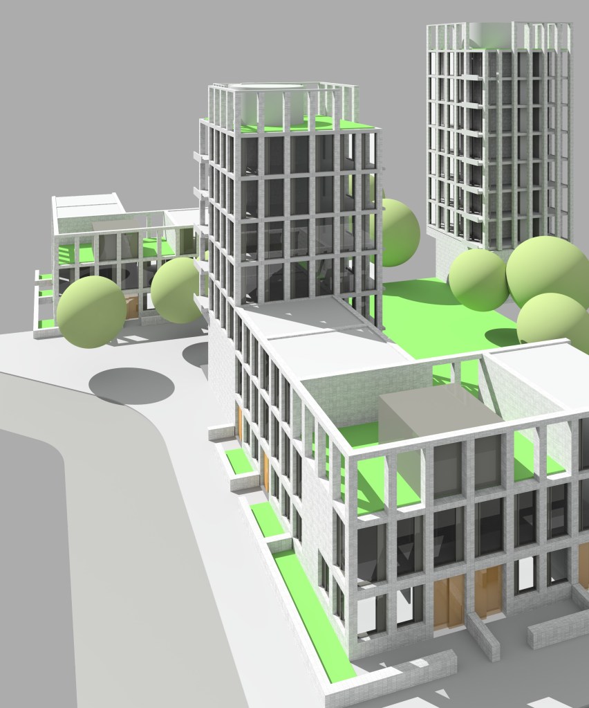 You might have spotted that no car parking is provided. In the next post, I’ll sketch an approach to urban design, street layouts and transport that can complement this typology.