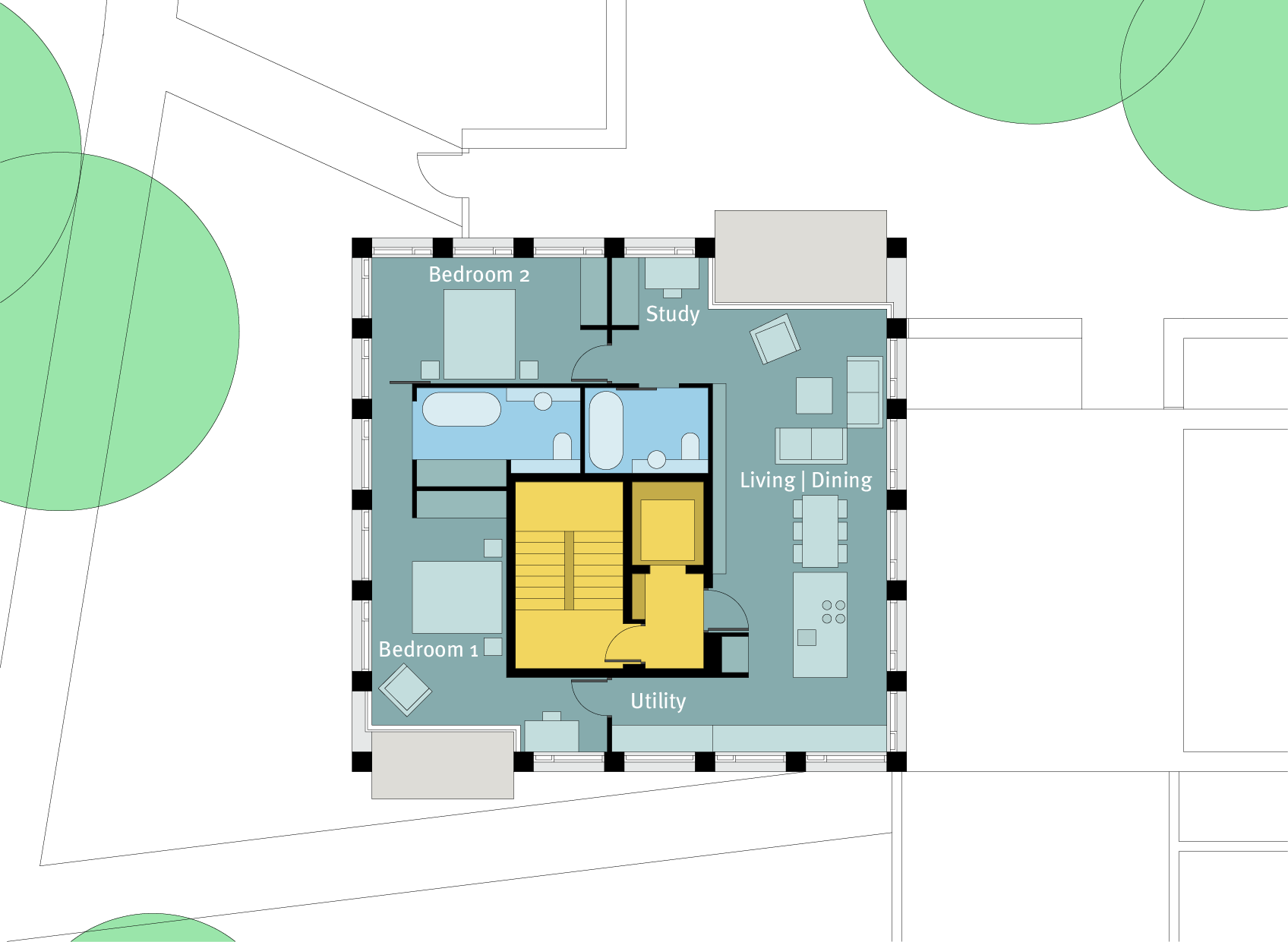 The roofs of the point blocks are planned as resident gardens, screened by the facades. A similar approach is taken with the houses to the corners of the block. Here, the interior angle makes it impossible to plan a garden at ground level for every dwelling; instead, the roofs of the houses are used as gardens as shown below.