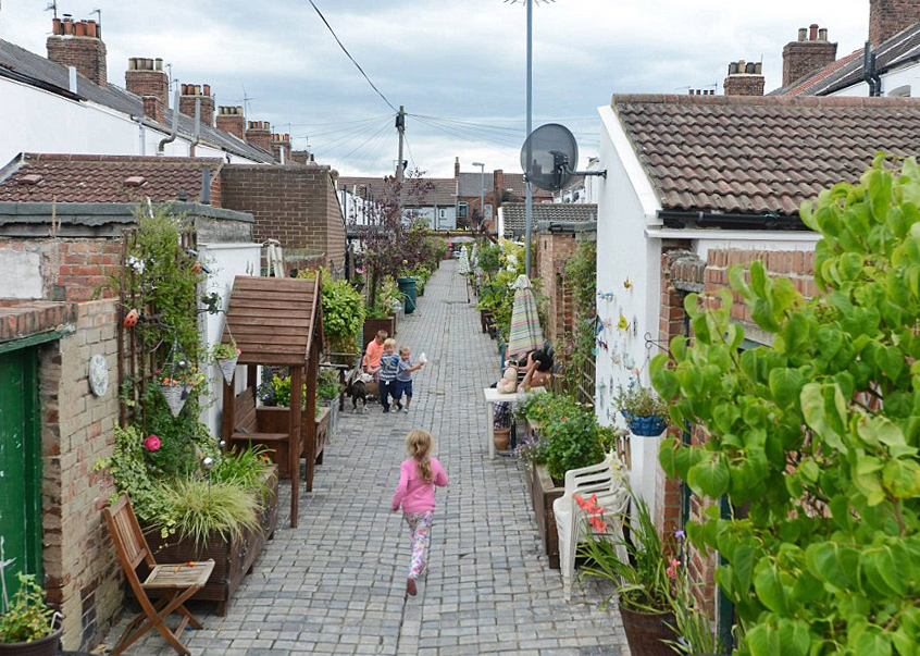 Typically, terrace back gardens remain fenced off from each other; however, in some places you see recognition of the potential of a connecting space within a terrace block interior: the image above shows a planted connecting passage in Middlesborough. Similar examples are found in Japan: Haruki Murakami describes such a space in his novel The Wind-Up Bird Chronicle. I think these spaces have further potential. The massing below describes a hybrid typology of terraced houses and point block towers (although slender, at one dwelling per floor). Together, these types enclose a block whose interior features a large, shared but secure garden for residents of all age groups.