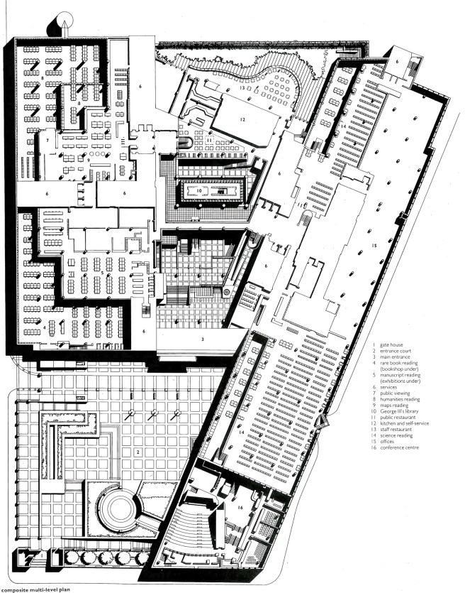Here I’d like to look at two examples. The first is the British Library building in St Pancras, by Long and St John Wilson, designed between 1982 and 1999 (pictured above). The plan of this large and complex building is not rectangular, and the change in angle across the plan corresponds to a basic split in library subject matter: ‘humanities’ and ‘science’. Within each area of the building, though, the geometry is orthogonal.